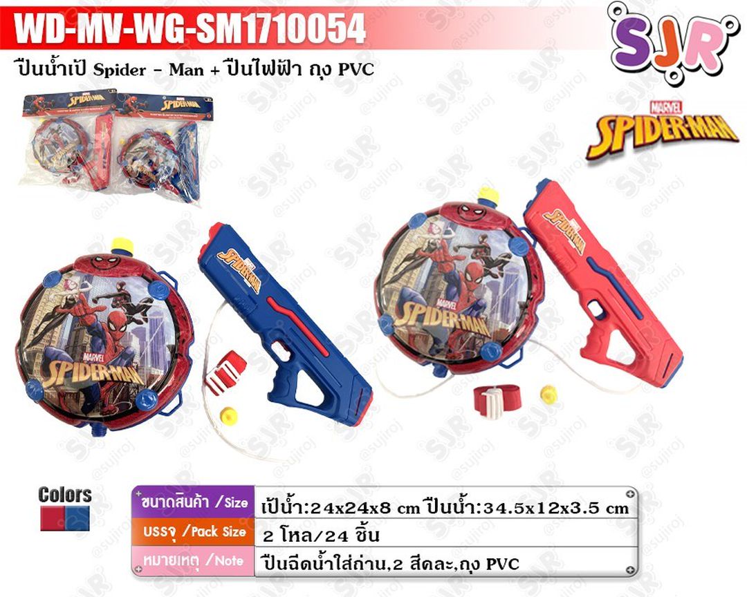 Spider-Man Electric Water Gun Backpack Water Backpack : 24x24x8 cm. Electric Water Gun 34 cm. 2 Doz. 2 Colors Asstd.