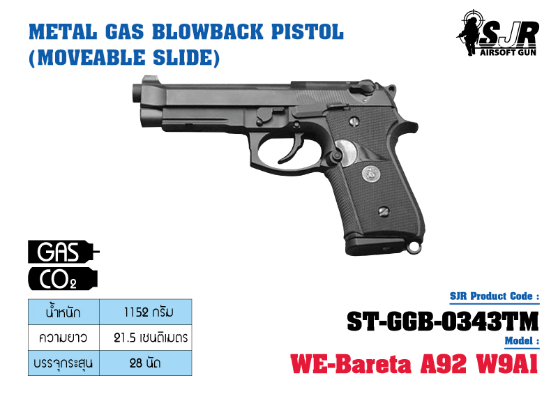 BB Gun Model WE-Bareta A92 W9A1 Gas, CO2 Weight 1,152 g. Length 21.5 cm. Load 28 Bullets.