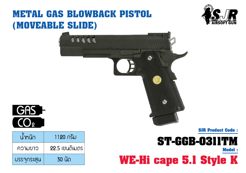 BB Gun Model WE-Hi cape 5.1 Style K Gas ,CO2 Weight 1120 g. Length 22.5 cm. Load 30 Bullets.